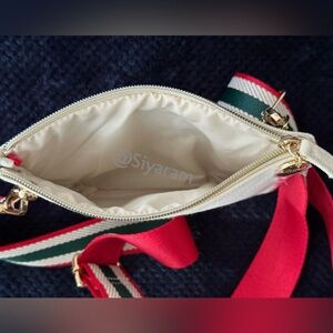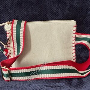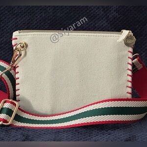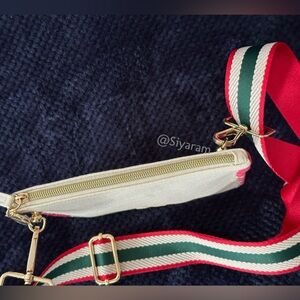 Cosmetic bag converted into crossbody bag by adding unbranded strap and rivets