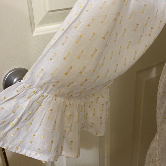 Dress features a front lace up closure and 3/4 sleeves. Ruffled sleeves and hem. 100% cotton. White with splashes of gold. Never worn