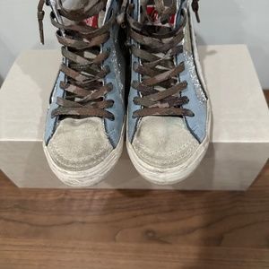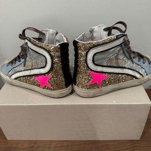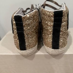 Different materials/ textures : suede front, glitter back and baby blue tech fabric panel on sides.
