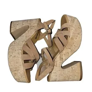 Set on a cool cork sole, these stunning platform sandals are featured in a retro-inspired style and soft suede fabrication with strappy woven details, a thin ankle strap, and towering block heel.