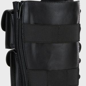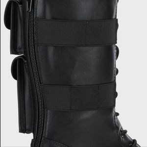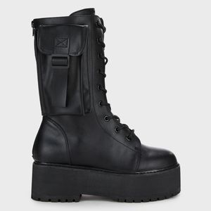 Y.R.U. Slayr Hi Desert Boots give 'em warrior vibes. These mid-rise combat boots have a vegan leather construction, platform soles, side pocket details, adjustable laces, and back zip closures. From the UK.