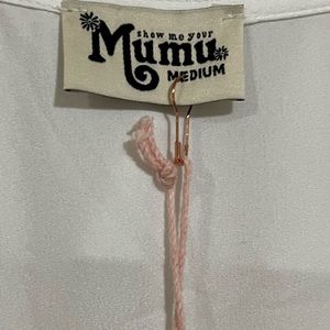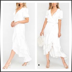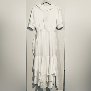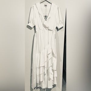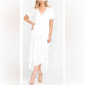 NWT Show Me your MuMu white wedding ruffled dress, short elastic sleeves, satin fabric. Detachable tie. Warped style, V neck. Very flattering!.