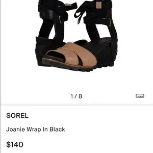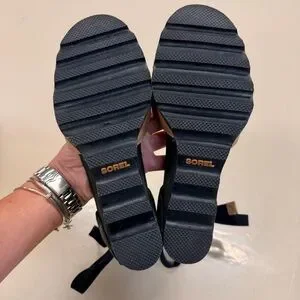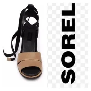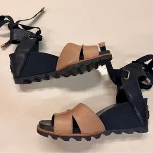 Sorel Joanie Two-Tone Leather II Hi Ankle Strap Wrap Wedge Sandals. Size 8. Black and tan.