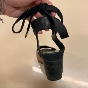 Wraparound ankle strap with tie closure, cushioned footbed, leather upper and insole/ rubber sole