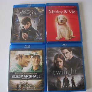 Bundle of 4 Home Family Movies Blue-Ray GUC. Contains : We are Marshall, Fantastic Beasts, Marley & Me<-3disc bad dog edition, & Twilight. Smoke Free, Pet Free home. Bundle & Save! Ships asap (within 1 day). Thank you for looking!