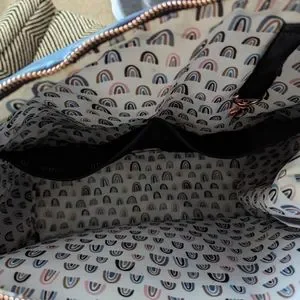 Trying to downsize to a smaller diaper bag since I don't need as large of a diaper bag. Very spacious with lots of pockets! There are three insulted pockets for a bottle, snacks, and even cold snacks can be stored for a limited time. It doesn't have the wipe case that came with it but it comes with a changing pad that was used for a previous diaper bag I owned.