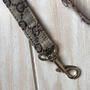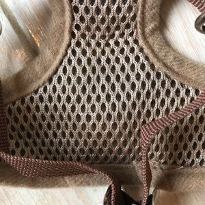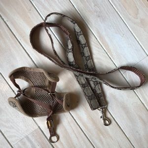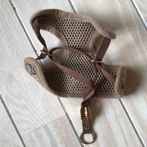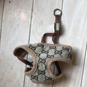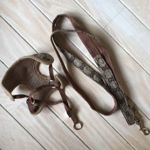 48” leash AND extra small harness -harness is adjustable and side closest to dog’s back is padded for comfort! Soft high style style pup!