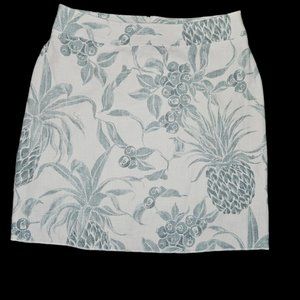 Artful illustrations depicting fruits and plands. Banded waist. Lining Viscose. Ramie/Cotton. About 18" long