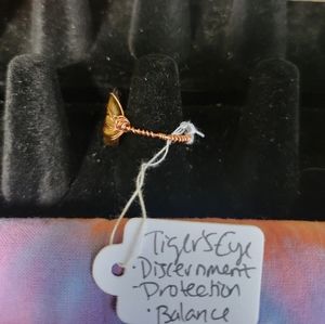 handmade, tigers eye ring wire wrapped with silver colored copper wire and lots of love. tigers eye aids with discernment, protection and balance. ring is delicate, as it is handmade, please don't wear while showering or sleeping. size 7.5. one of a kind.