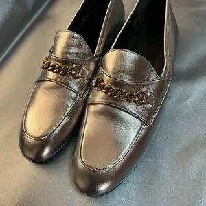 New!! TOM FORD metallic leather loafers. Flat stacked heel. Round toe. Keeper strap with curb-chain trim. Notched vamp. Slip-on style. Leather lining.