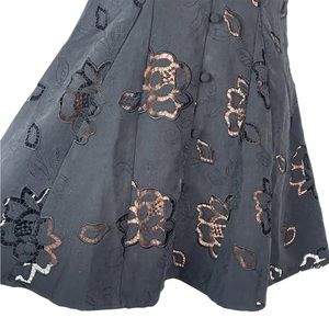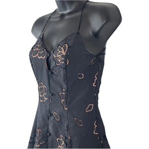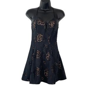 Dreamy mini dress featuring oversized embroidered rose cutouts and dainty buttons at front. Small keyhole at bust with a delicate shoulder ties.