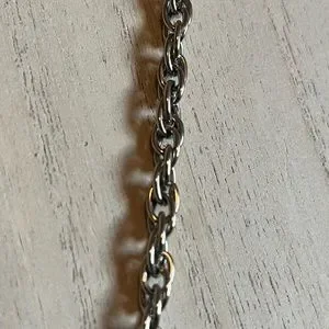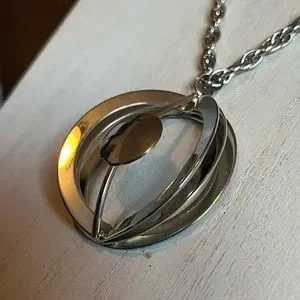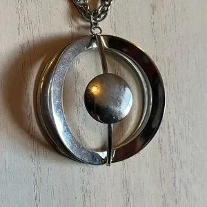 Abstract circular pendant hanging on a chain that is thick but not super chunky with a spring ring clasp.
