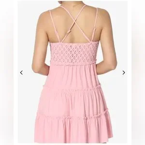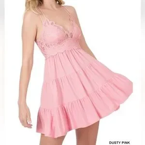 Zenana Outfitters Crochet Lace Ruffle Cami Dress In Dusty Pink. NEW! Embrace Boho vibes with ruffle tiered details and a flattering stretchy smocked back for the perfect fit and any occasion. Plunging V neckline. Adjustable crisscross straps and removable pads. Crochet lace detailing. NEW! Still in original packaging. Sz L & XL