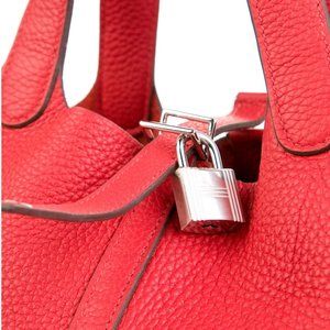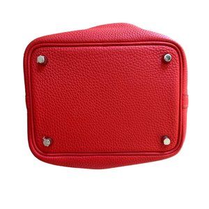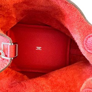 Hermes Picotin 18 bag from the 2020 collection. Rouge Tomate Clemence leather. Palladium-plated hardware. Flat handles. This bag is an iconic open top handle bag which is very desirable and collectible right now. Protective feet at base.