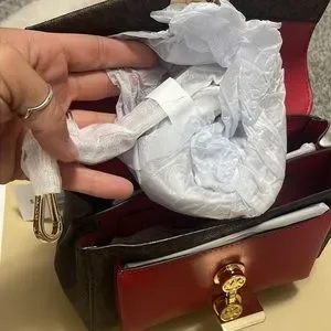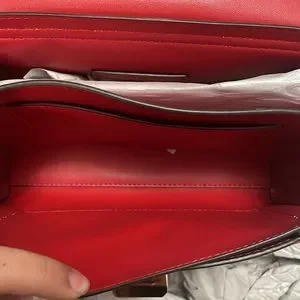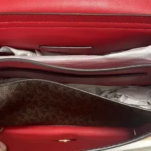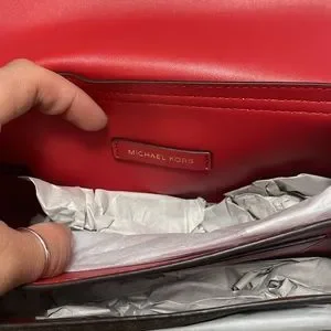 Micheal Kors Lita Medium top handle satchel in beautiful, vibrant bright red color “Flame”. This bag is made from the top quality MK smooth leather and elegantly detailed with gold tone hardware, back & front pockets, chained top handle and beautiful Logo snap lock on front pocket.