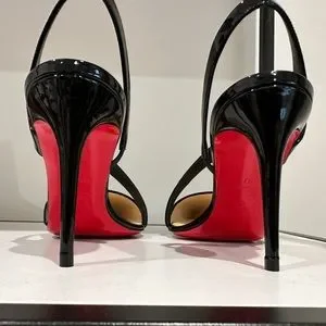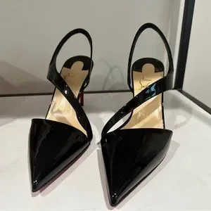 Description: Patent leather heels in black. Pointed toe. Strap at vamp with partially elasticized slingback strap. Covered stiletto heel. Signature red leather sole. Approx. 3 heel height.