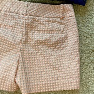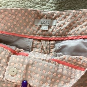 LOFT Marisa Shorts. Gorgeous champagne color with peachy pink embroidered dots. Flat front. Front hook, button & zip front closure. Pockets. Belt loops. Laying flat waist approx 16” across. Inseam approx 4”. 61 polyester 39 cotton. Size 4. Excellent condition.