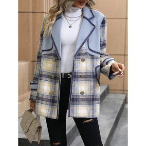 Casual Plaid Double Breasted Contrast Trim Overcoat Blue
