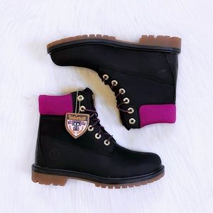 New In Box- Timberland Women’s Heritage 6 Inch Waterproof Boots In Black Nubuck Leather With Pink Padded Collars, Seam-Sealed Construction, 200g PrimaLoft Insulation, Anti-Fatigue Footbeds And Rubber Lug Outsoles.