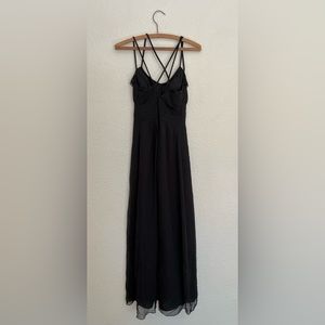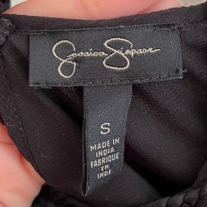 This is a great Jessica Simpson black maxi dress. It has a nice ruffled front and braided straps. Material is 100% polyester and size is small. It is a long, and flowy style.