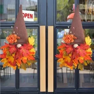 Welcome Fall with this beautiful handmade wreath featuring autumn maple leaves in a variety of colors. Measuring 20 inches in height and 12 inches in width, this door decoration is perfect for any home. The wreath is adorned with a cute gnome and is made from mixed materials, giving it a unique and festive touch.