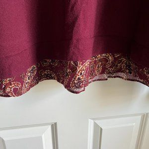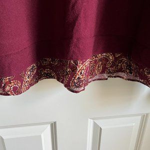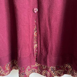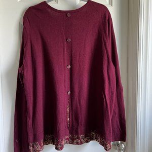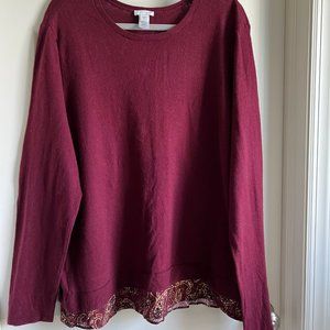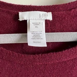 Excellent condition. J. Jill Sweater in Maroon. Beautiful rayon design at the bottom of sweater. Looks like a shirt underneath the sweater. Buttons down back of sweater. Size XL. 70% cotton, 30% Nylon. Hand wash cold, lay flat to dry. Some minor pilling.