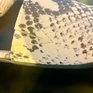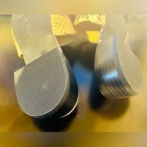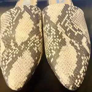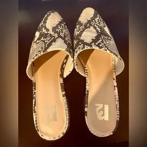 Size 7 M. Just like new! Worn maybe 1-2 times. Shoes are in good condition as are the heels. Faux snakeskin print mules/ black and beige design. Heel is just over 1 inch. There are elastic slits on mule designed for comfort when you walk. Snakeskin print shoes are on trend this season!