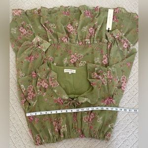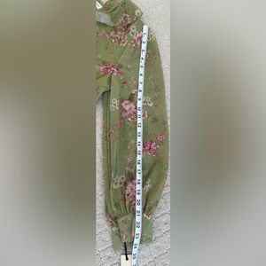 Features: Feminine Floral Print, Feminine Floral Print, Midi Length. Ruffle V Collar. Chiffon Sleeves