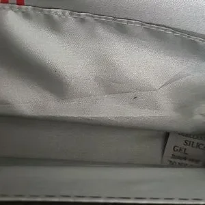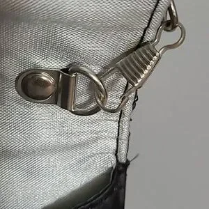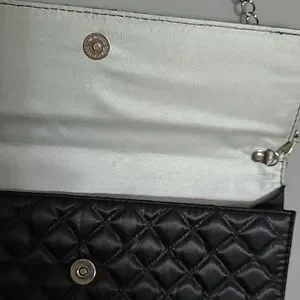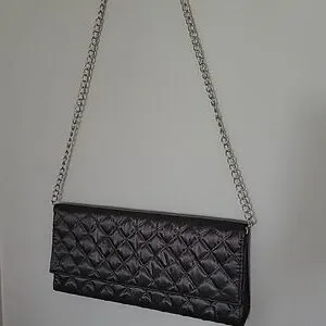 A black quilted purse with silver chain strap or it can be a clutch. It snaps together.