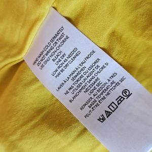 Yellow with multicolored flowers and fruit, faux wrap, ruffled v-neck and hem. Self tie belt, sleeveless. Great pre-owned condition.
