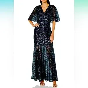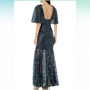 NWT! Dress the Population Lourdes Flutter Sleeve Sequin Lace Long Gown