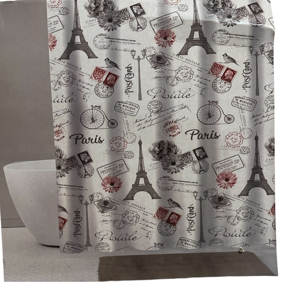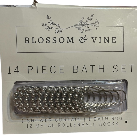 This set includes a pretty Paris shower curtain and 12 silver rollerball hooks. It DOES NOT have the bath mat. I needed a mat and thought the curtain would match my bathroom. Unfortunately it did not😟. The hooks are still in the plastic and the curtain is still folded on it’s hanger. Smoke and pet free home.