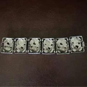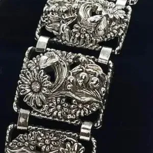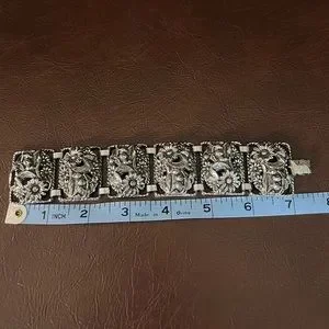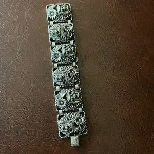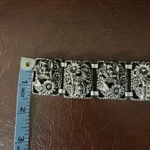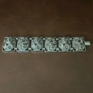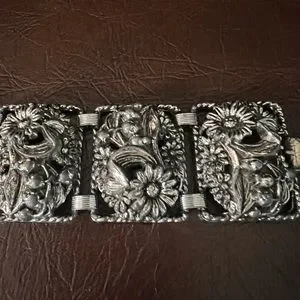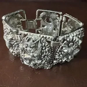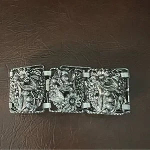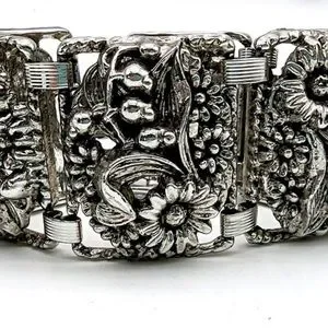 Vintage Sarah Coventry floral silver tone bracelet, 1960s panel bracelet, highly detailed, chunky, wide links, statement piece, signed on the folder over clasp, 1.2” wide, 7.1” in length (7.5” with clasp), excellent condition.