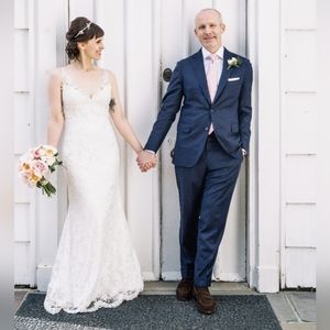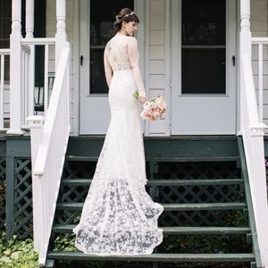 This ivory dress has a slender column silhouette with a sheer lace overlay and a full hand-sewn train. There is a deep V-neck framed with scalloped lace. It has elegant lace straps, a lace illusion back detail, and is finished with satin-covered buttons.
