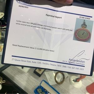 Cartier open face 18k gold vintage mechanical pocket watch with pink and white enamel and set with rose cut diamonds. Appraisal will be included with the purchase