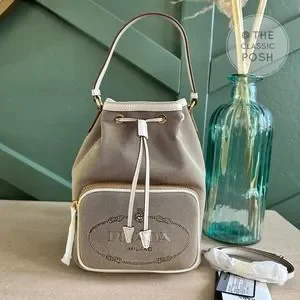 NEW Prada Jacquard Logo Bucket White Trim Canvas Tote Crossbody Bag