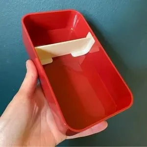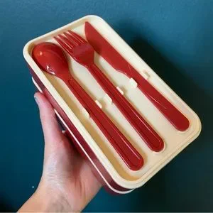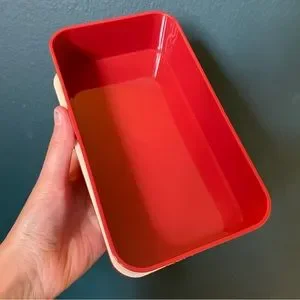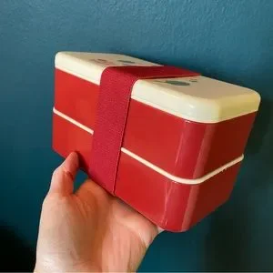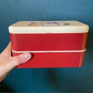 “Bon Appetit” Hawaiian chick and shark print two layer lunch box, comes with plastic utensils and an elastic band to hold both boxes together. Measures 7 inches wide, 4 inches tall and 4 inches from front to back when fully assembled. Never used. Cute, kawaii, great for carrying in your bag and traveling.