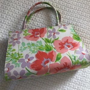 Floral vintage cloth covered handbag, ca 60s. In very good condition! Labeled ‘Margaret Smith, Gardiner, Maine. Fabric handles. Zipper top. Green satin lining, with ‘E. Good’ written in black on inner pocket. Slight musty odor which I hope will disappear once it airs out a bit. Very faint discoloration here & there. In deep storage in a non-smoking, pet-free home. Measures about 11” wide, 7.5” in height, and 4” across the bottom. Light as a feather and pretty to boot!