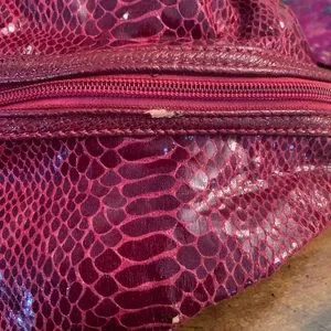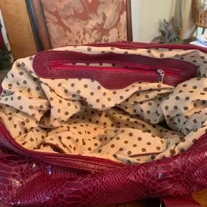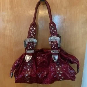 Beautiful red alligator look purse with metal,studs and stones. Has one large zipper pocket inside and two small pockets. Comes with dust bag. Used once. Perfect but for two spots by zipping that has small peeling. Shown in picture. Measurements: 18” wide, 11” deep and 4” wide inside. Straps 12” from shoulder to purse.