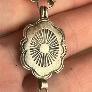 This is an interesting piece of Native American silver work. There are 23 interlinked discs. They look to be a sunflower pattern. It tests positive for silver but I cannot tell if it’s Sterling or coin. This exact same style is attributed to Roger Skeet on other pieces I have seen. Unfortunately there are no makers marks visible on this piece. There are repairs needed. The style is alternating large and smaller discs. In the middle a larger disc needs to be removed to restore the pattern. Silver solder will be required to make this good. There is a hook clasp which needs to be matched with a new ring. Some of the connections need to be straightened. These are minor repairs for a silversmith!!! Ultimately you will be left with a beautiful piece! These pieces are highly collectable.