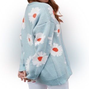 Tags: flower floral white blue sky blue teal turquoise aqua orange bright colorful neon cozy knit sweater cardigan open front y2k 90s retro hippie boho bohemian plus size fun youthful daisy winter fall spring layer warm comfy