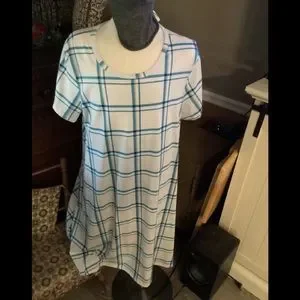 LuLaRoe Carly Dress- 2XL white with blue. Never worn, Navy Joy vest not included but is for sale too.