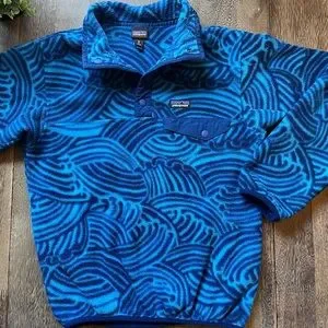 One of my favorite Patagonia prints- waves đ. Beautiful shades of blues. Boys size Medium (10) but is gender neutral in my opinion. Quarter snap. Preloved- does show normal signs of wear. Scuffs on pocket and buttons. Small dot of paint on left sleeve, but overall great condition. This print is hard to come across and Iâve seen these sell between $85-$110 used. Please no low offers. Cheers!