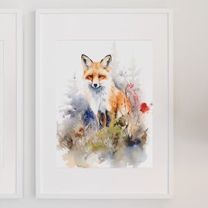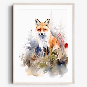 Watercolor Floral Red Fox Portrait Wall Art Illustration Print Poster Unframed