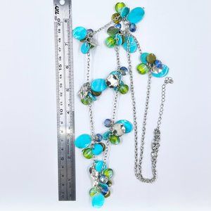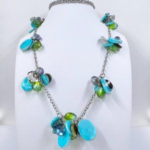 NWT - Lane Bryant - Turquoise & Green Dyed Shell Silver Tone 36” Necklace. Necklace has clusters of dyed turquoise shell, dark and light green glass beads, faceted aurora borealis glass beads, and the extender chain is 3” long. Necklace is new with tags and is from overstock or liquidated merchandise. Necklace is in great condition.