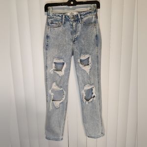 These jeans from Hollister are a mom fit with distressed holes and go well with casual wear. In good condition, in a women's size 23.