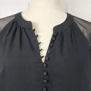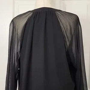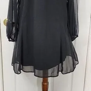 Beautiful, elegant woman's little black dress, buttoned down, flowy fabric, sheer, fully lined, ballooned long sleeves. It could be mimi, depending on your highth.