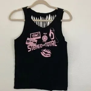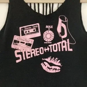 Super cute distressed band tee/tank from Stereo Total concert. Lips, boots, cassettes!