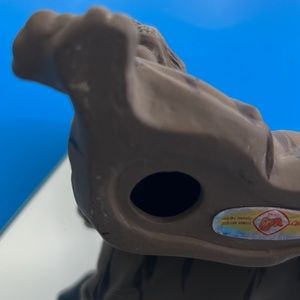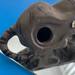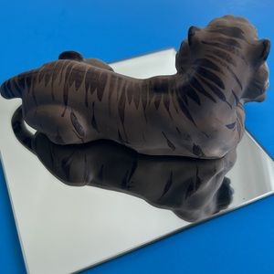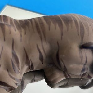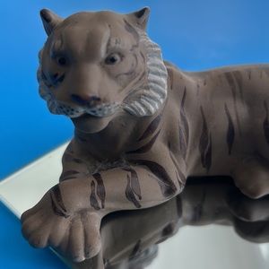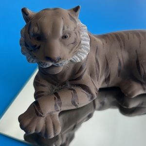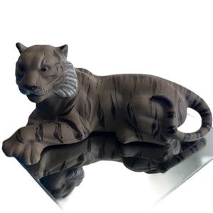 vintage porcelain hand painted detail black tan beige brown white highlights figurine statue laying down poised position cross legged pottery collectible display shelf curio China cabinet