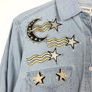 Vintage Denim Button Front Shirt Sun Moon Stars Applique Patches Rhinestones M